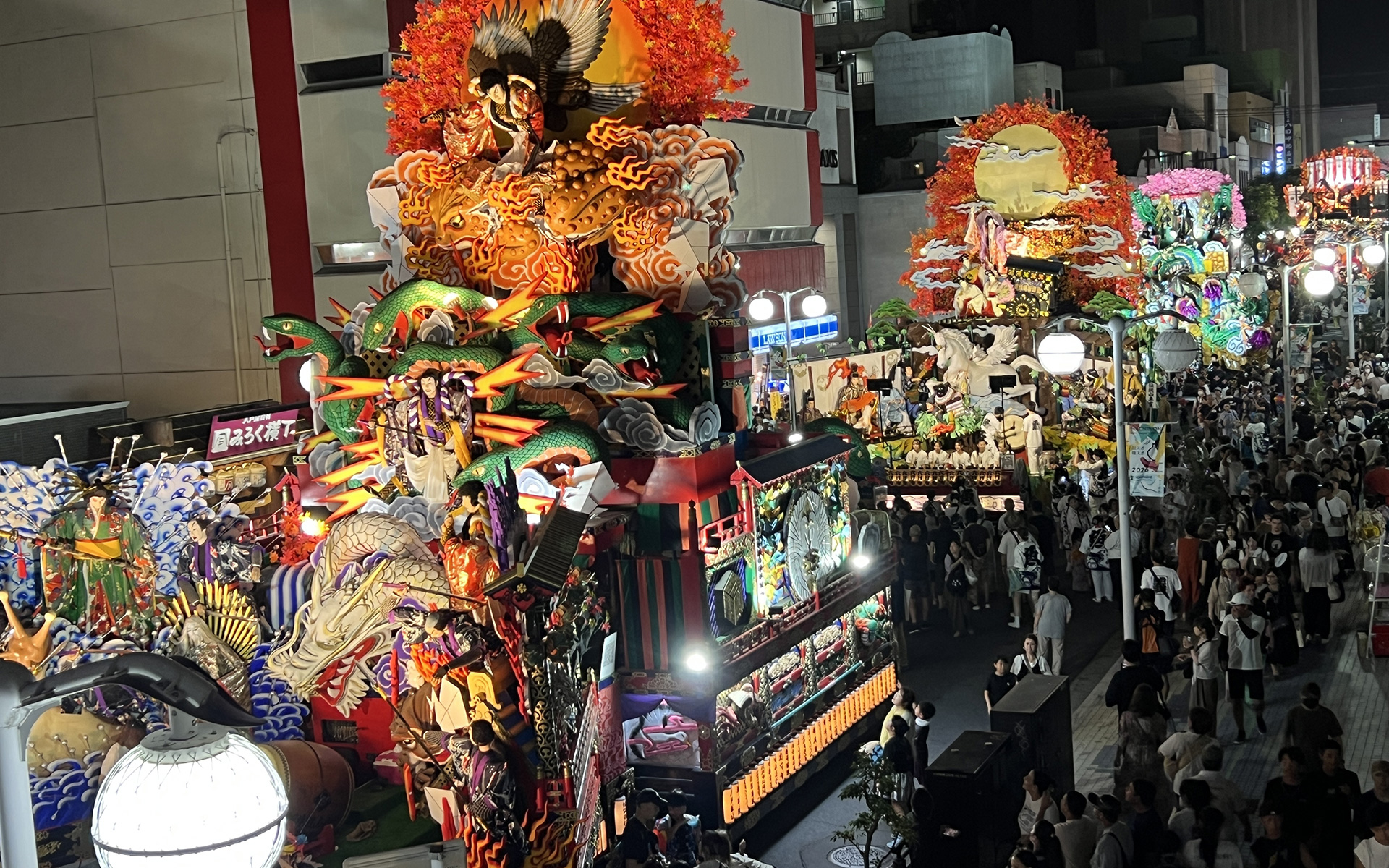 JR八戸線「本八戸駅」から徒歩約10分の場所にある八戸市中心街では、毎年7月31日から8月4日まで、ユネスコ無形文化遺産「山・鉾・屋台行事」のひとつである「八戸三社大祭」が開催されます。延べ100万人以上が訪れ、古式ゆかしい神社行列と、豪華絢爛な山車の競演が見どころです。